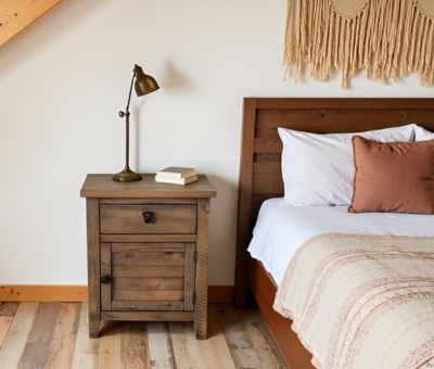 Solid Acacia Wood Nightstand – Rustic Gray Bedside Cabinet Storage Table