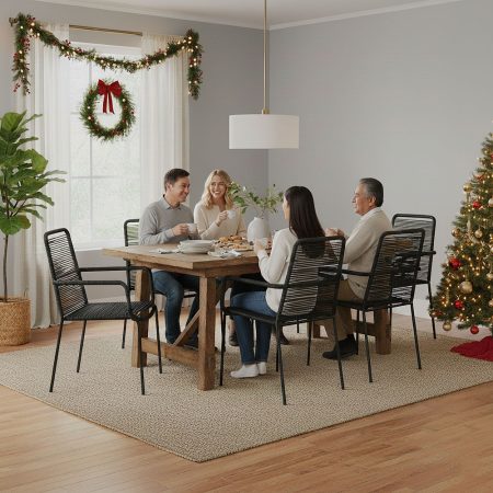 Black Patio Stackable Chair Set of 4 – Steel Frame Outdoor Dining Chairs with Rope Weaving
